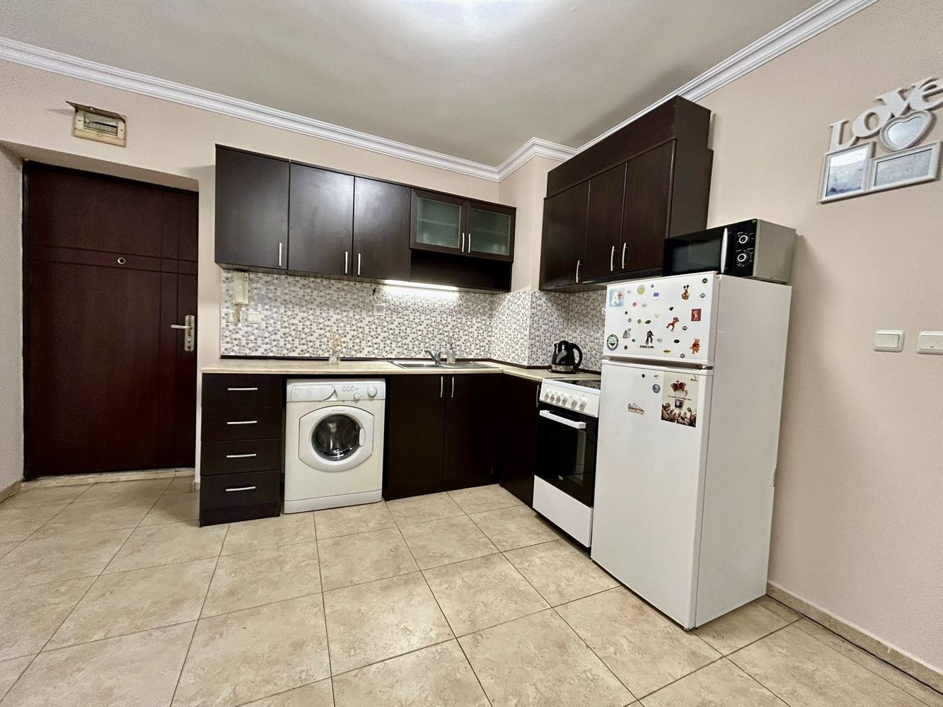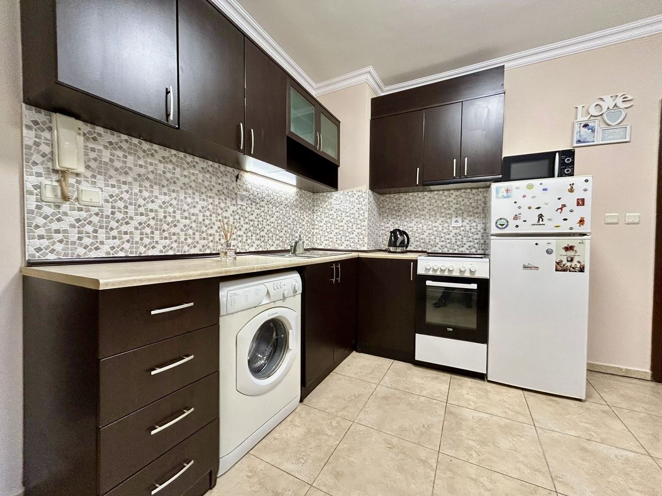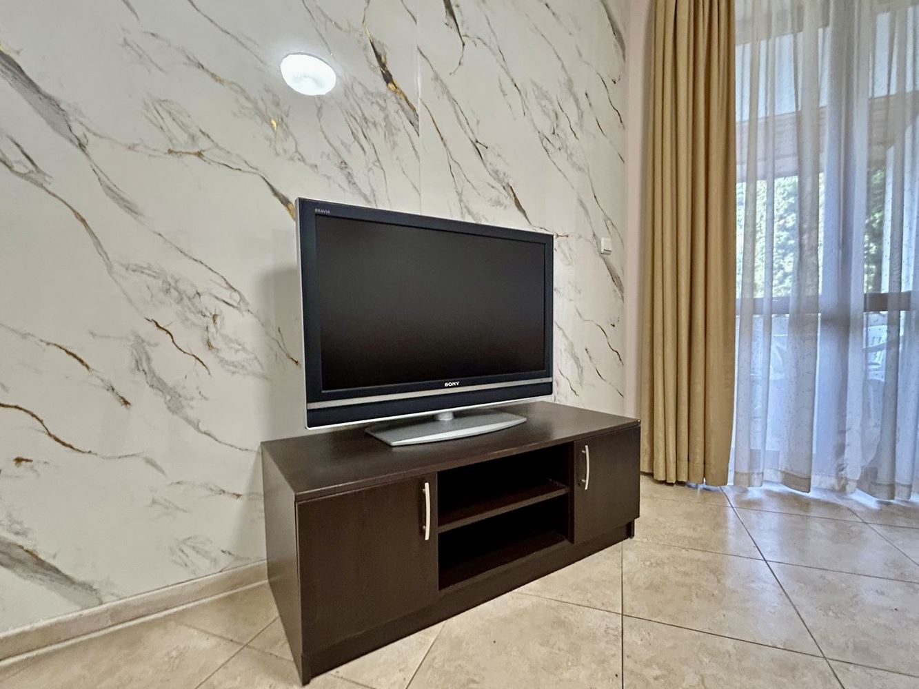 Апартаментът е напълно обзаведен и оборудван с мебели и електроуреди, готов за незабавно нанасяне. Всички интериорни елементи са подбрани с внимание към детайла, съчетавайки стил и функционалност, което позволява на новия собственик да се наслади на жилището без допълнителни инвестиции.