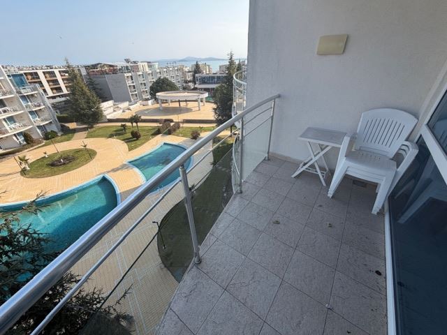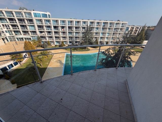 Жилището предлага просторна дневна, две самостоятелни спални и баня с тоалетна, като към антрето е добавено удобно пространство за съхранение, а една от спалните разполага с дрешник. Всяка стая има собствена тераса, от която се открива гледка към басейните и красиво озеленения вътрешен двор на комплекса, създавайки усещане за спокойствие и уют.
