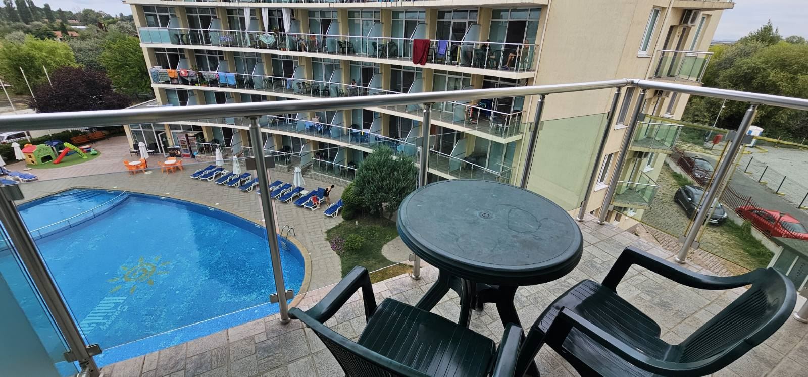 Комплексът, в който се намира имотът, предлага богата гама от удобства, създадени да осигурят пълноценен престой и високо качество на живот. На разположение на обитателите е голям плувен басейн със зона за слънчеви бани, където може да се насладите на летните дни в спокойна и приятна атмосфера. В комплекса има уютен ресторант, подходящ както за ежедневни хранения, така и за срещи с приятели, както и детска площадка, която осигурява забавление и сигурна среда за най-малките. Двадесет и четири часова охрана допълва усещането за сигурност и спокойствие, независимо дали имотът се използва постоянно или сезонно.