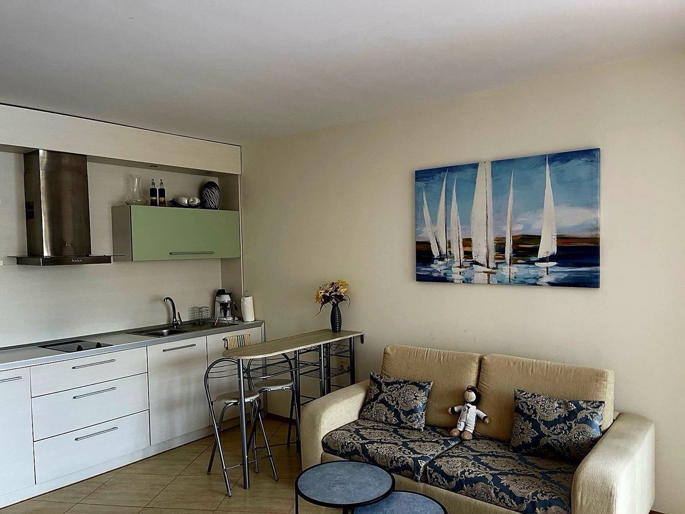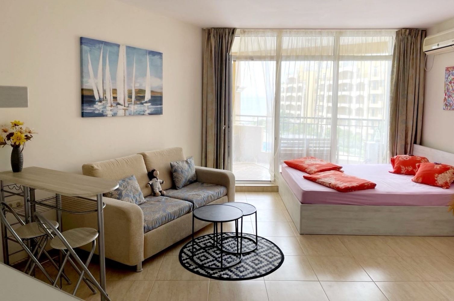 Предлагаме за продажба светло и просторно студио, разположено на четвърти етаж, непоследен, в модерен комплекс на първа линия в град Ахелой. Имотът е с площ от 49 м² и впечатлява с функционално разпределение, комфорт и вдъхновяваща гледка към морето, която създава усещане за спокойствие и ваканционно настроение през цялата година. Жилището предлага отворено пространство, което съчетава дневна зона, кът за хранене и зона за почивка. Големите прозорци осигуряват изобилие от естествена светлина и разкриват панорамна морска гледка, превръщайки всеки ден в истинско удоволствие. Пространството позволява лесно обособяване на различни функционални зони според индивидуалните предпочитания на бъдещите собственици.