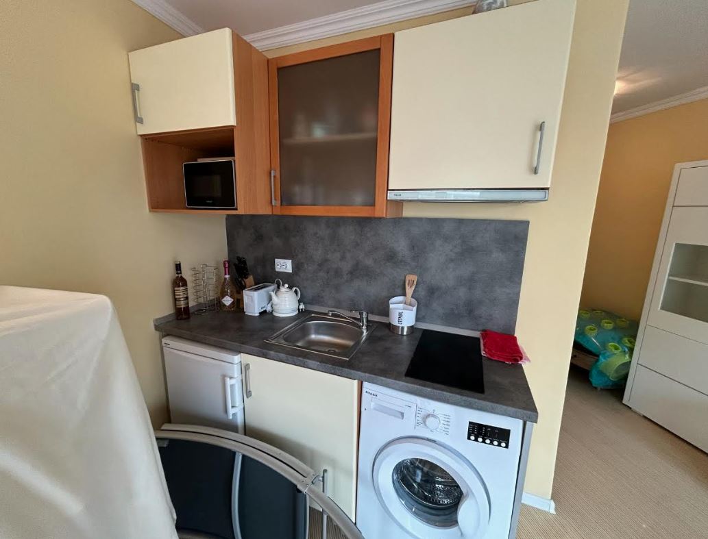 Представяме ви едно приказно студио в сърцето на най-популярния курорт по българското Черноморие – Слънчев бряг. Този уютен имот е с обща площ от 43,44 м2 и е идеален избор за ваканционен дом или инвестиция с цел отдаване под наем. Студиото е проектирано с открито и функционално разпределение, което създава усещане за простор. Общата стая е светла и комфортна, обзаведена с всички необходими мебели, които ще удовлетворят нуждите на бъдещите собственици. Имотът разполага с една баня, оборудвана със съвременни санитарни съоръжения. Балконът е истинско бижу на този имот. Намира се на уникално място и ви осигурява уединение и възможност да се насладите на сутрешното кафе с изглед към басейна на комплекса. Терасата не е включена в общата квадратура, но предлага чудесна възможност за разширение или усвояване в любимото ви кътче на открито.