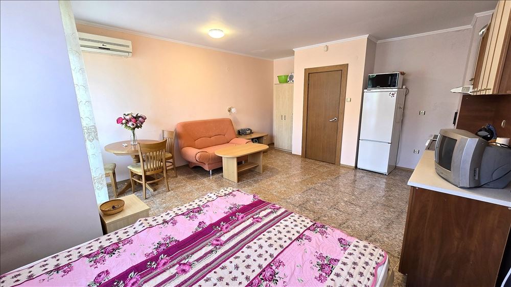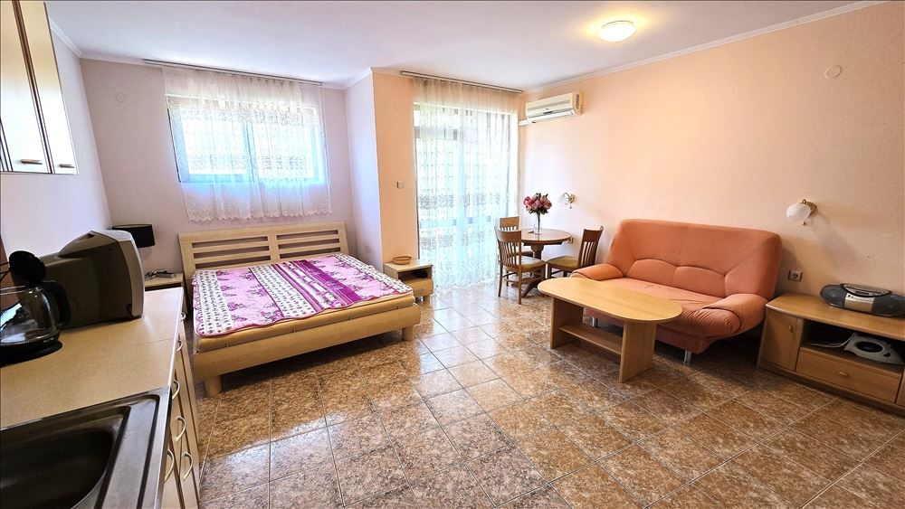 Представяме ви функционално и просторно студио с обща площ от 42 м² в един от най-предпочитаните райони на Слънчев бряг. Имотът се намира само на 400 метра от плажа и на 10 минути пеша от централната част на курорта — перфектен баланс между спокойствие и удобство. Студиото разполага с една светла и просторна стая с възможност за обособяване на зони за спане, дневен кът и кухненска част, както и удобен балкон за сутрешно кафе или вечерен отдих. Банята е самостоятелна и практично разпределена. Правилната форма на пространството позволява лесно персонализиране според вашия стил и нужди.