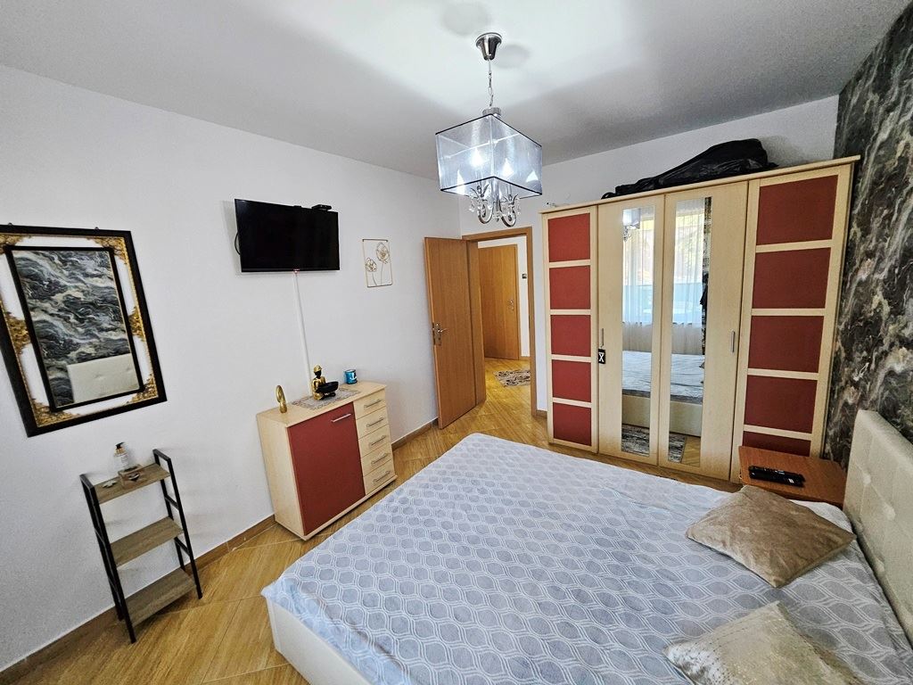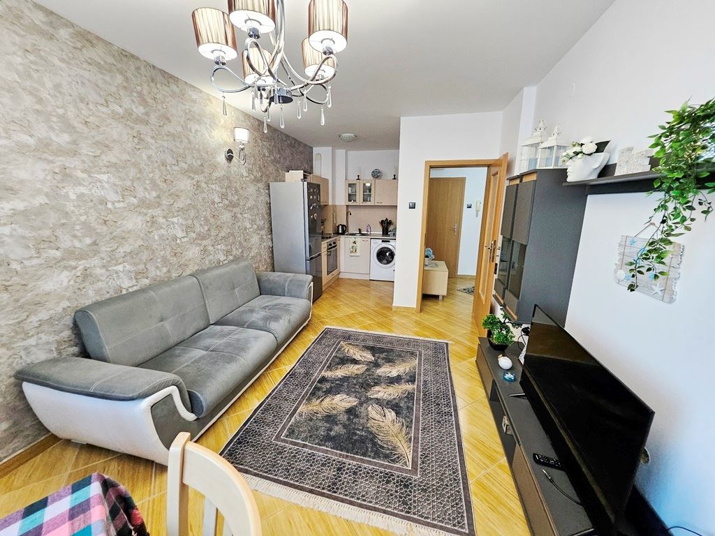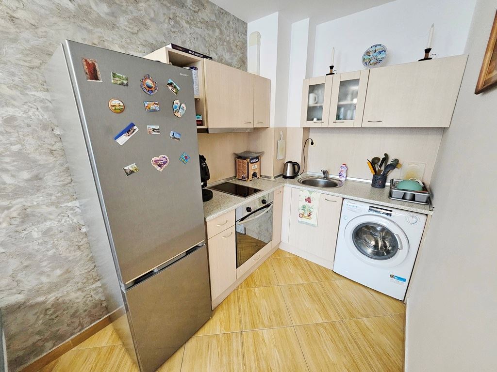 Продава се великолепен двустаен апартамент в близост до плажа на к.к. Слънчев бряг. Този стилен и уютен имот с обща площ от 66 м2 е разположен на втория етаж в съвременна сграда с асансьор, което го прави идеален за вашия нов дом или ваканционно убежище. Апартаментът предлага комфортно разпределение и функционалност. Влизайки, ще намерите просторен коридор, водещ до слънчева дневна с кухненски бокс. Комфортната спалня предоставя идеално място за отпочиване и релакс. Балконът към жилището предлага красива гледка към басейна и околността, където можете да се наслаждавате на красиви гледки. Апартаментът е напълно обзаведен и оборудван с всичко необходимо, за да се настаните веднага. Модерната баня е внимателно проектирана за удобство и функционалност.
