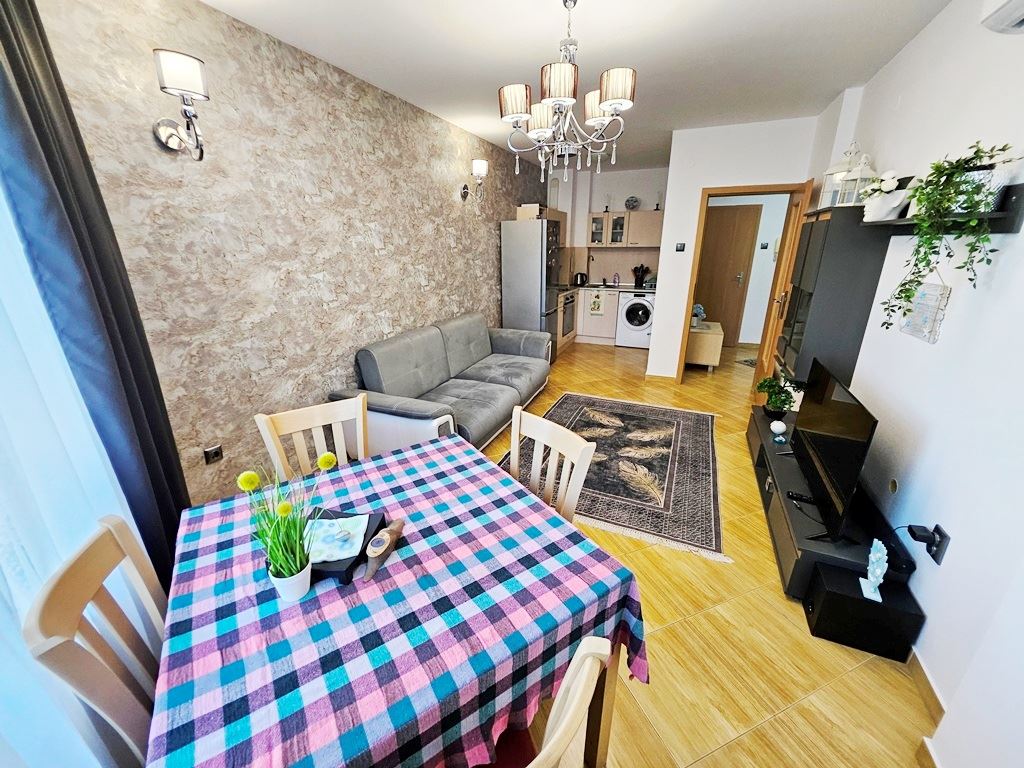 Комплексът, в който се намира апартаментът, предлага разнообразие от удобства, включително плувен басейн, детски басейн и детска площадка, което го прави перфектен вариант за семейства с деца. За допълнителната ви сигурност и удобство, на ваше разположение са охрана и собствен паркинг.