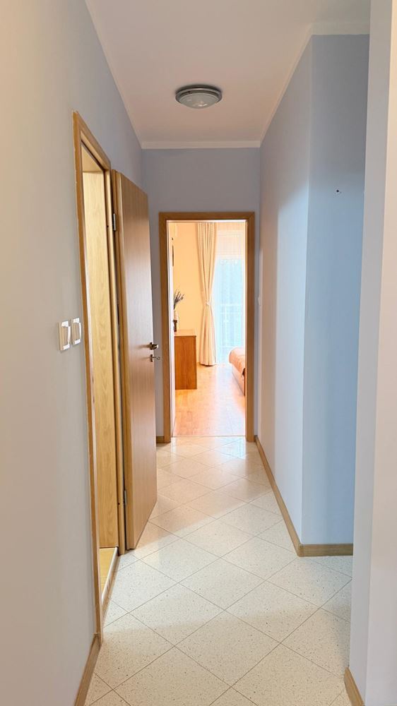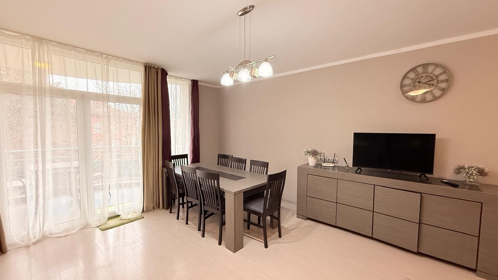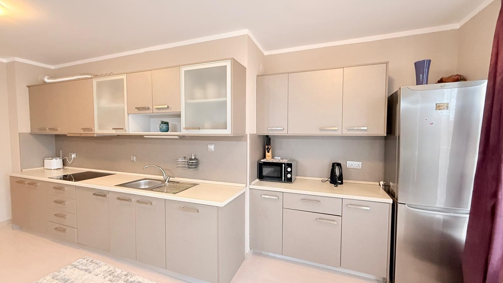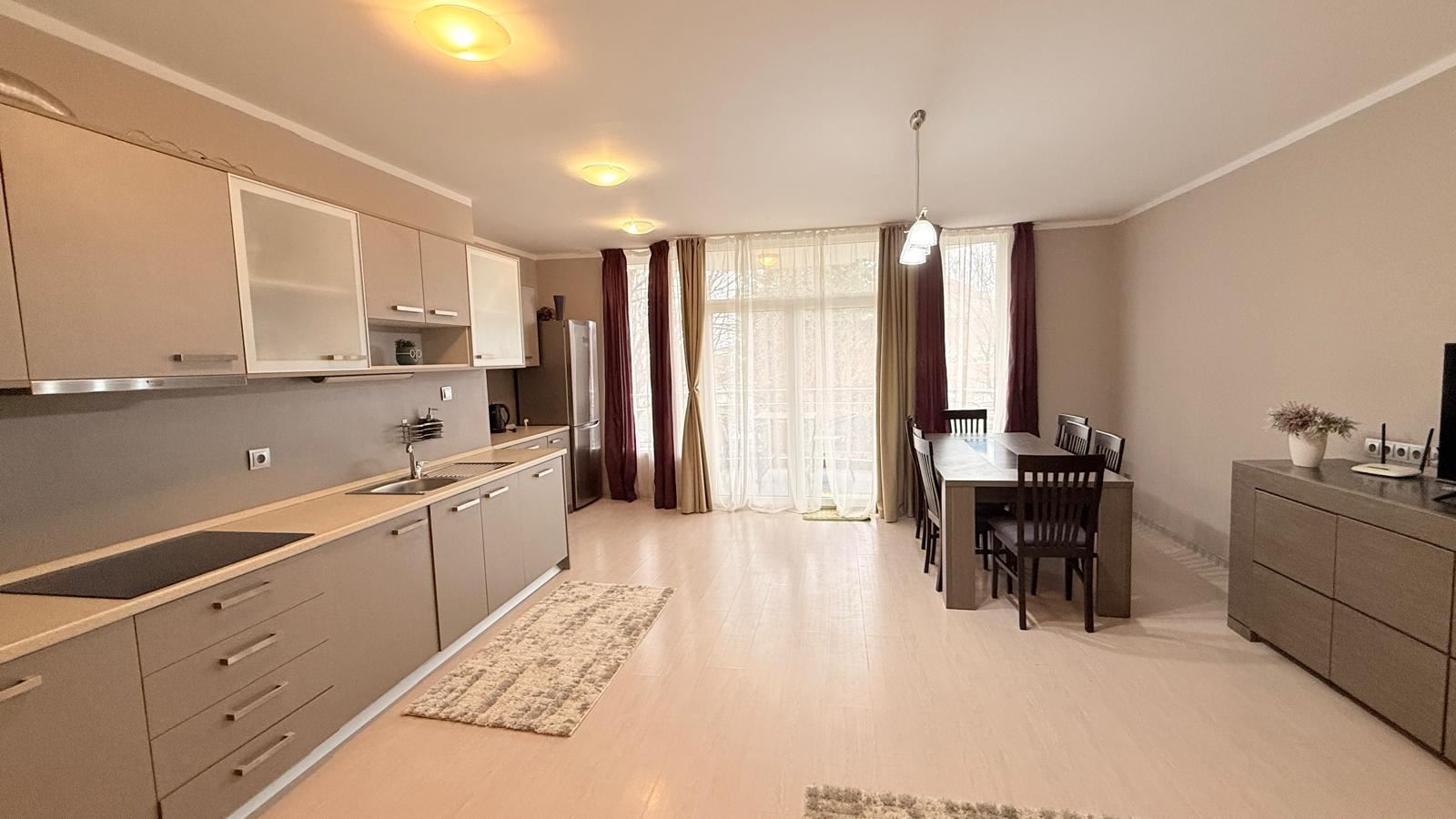 Апартаментът впечатлява с функционално и комфортно разпределение, създадено с мисъл за удобството на съвременното семейство. Просторната дневна с кухня е светла и уютна, с изцяло нова, модерна кухня, оборудвана с чисто нови електроуреди, както и стилни мебели, подбрани с внимание към детайла. От дневната се разкрива красива гледка към морето, която създава усещане за простор и спокойствие.