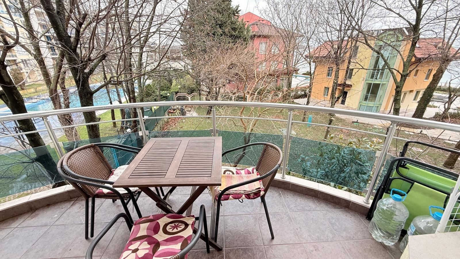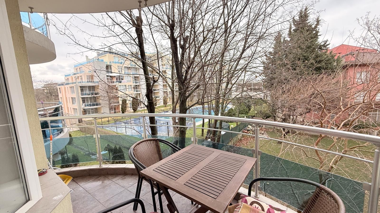 Комплексът предлага богат набор от удобства, които правят имота изключително привлекателен за целогодишно живеене или като инвестиция. На разположение са басейн, детски басейн, детска площадка, рецепция, кафе, денонощна охрана и паркинг, които осигуряват спокойствие, сигурност и удобство за всички обитатели.