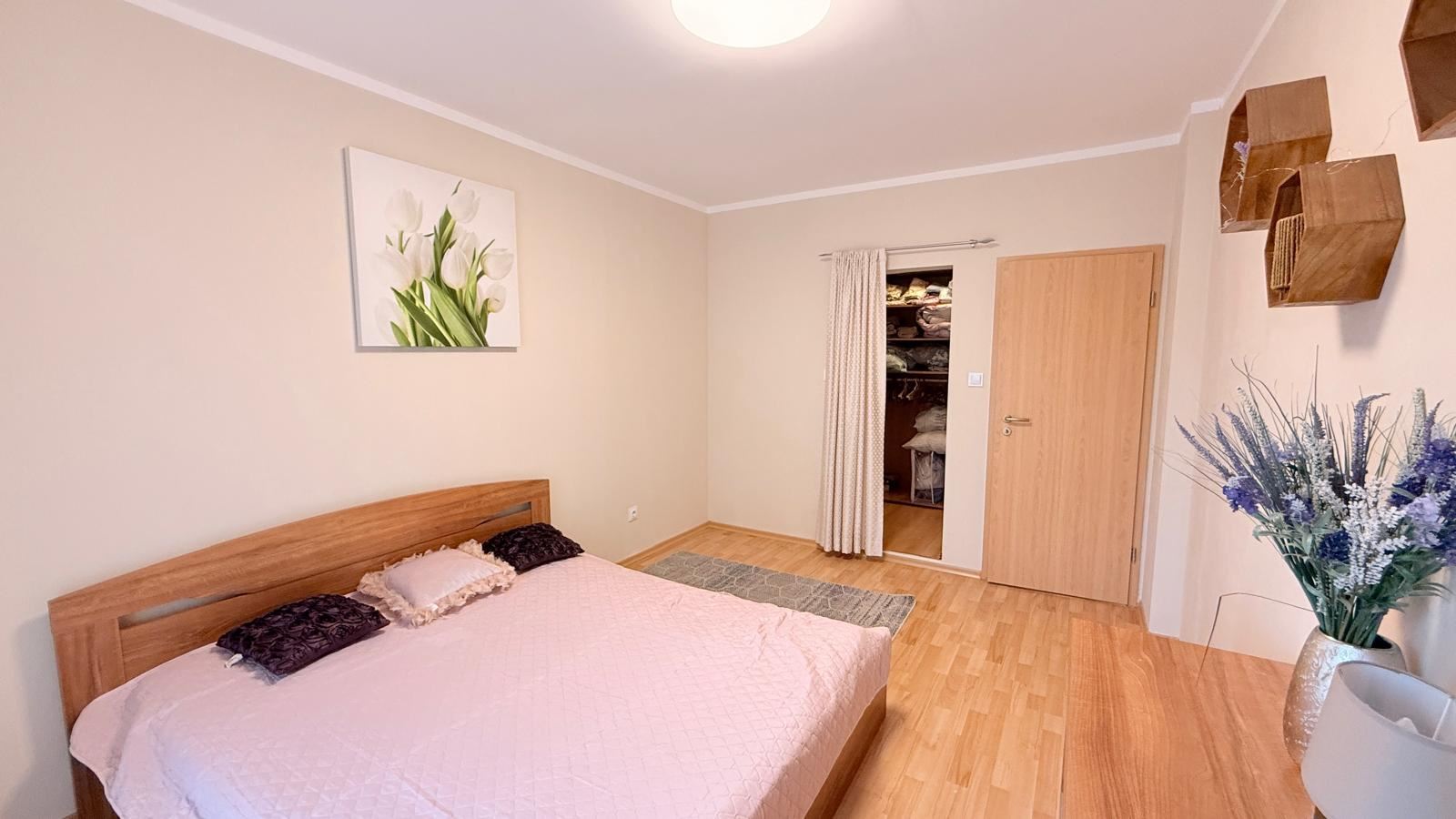 Двете спални са просторни и добре организирани, като едната разполага с самостоятелна гардеробна – изключително практично и рядко срещано предимство. Апартаментът разполага с две модерни бани, изпълнени с висококачествени материали, осигуряващи максимален комфорт както за семейството, така и за гости.