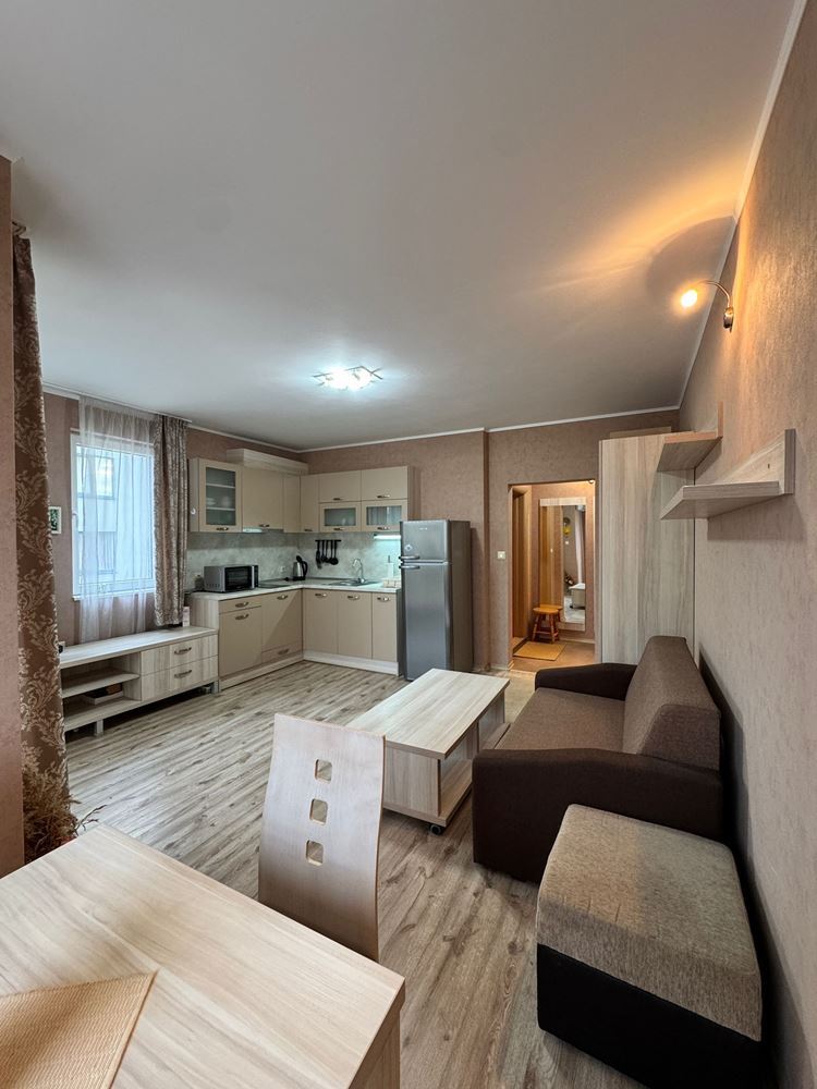 Студиото предлага отворено пространство, което съчетава кът за отдих и сън, трапезен кът и практична кухненска зона. Жилището е модерно обзаведено и оборудвано с всичко необходимо за комфортно обитаване – готово за нанасяне веднага, без допълнителни инвестиции. Банята е светла и поддържана, с качествени довършителни материали. От дневната се излиза на удобен балкон – приятно място за сутрешно кафе или релакс в края на деня.