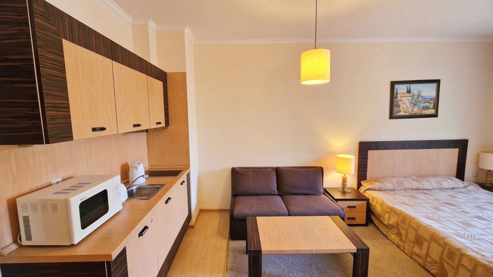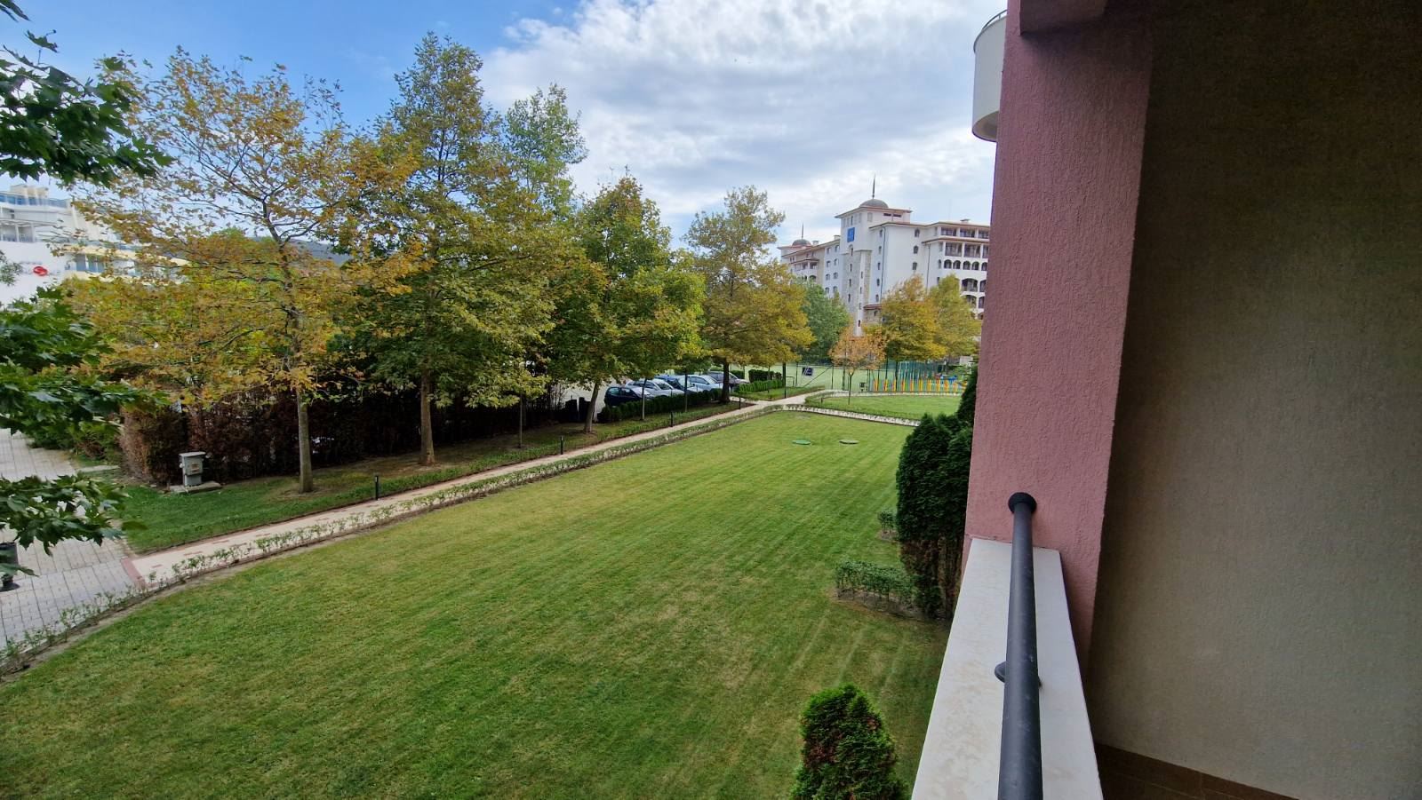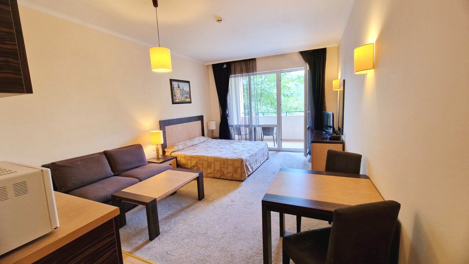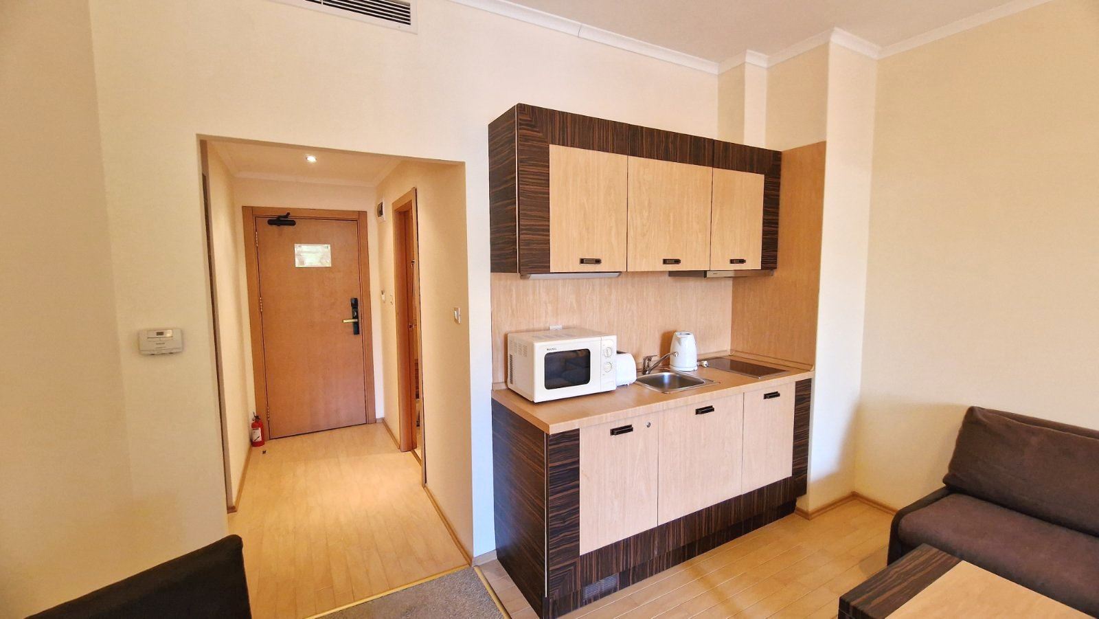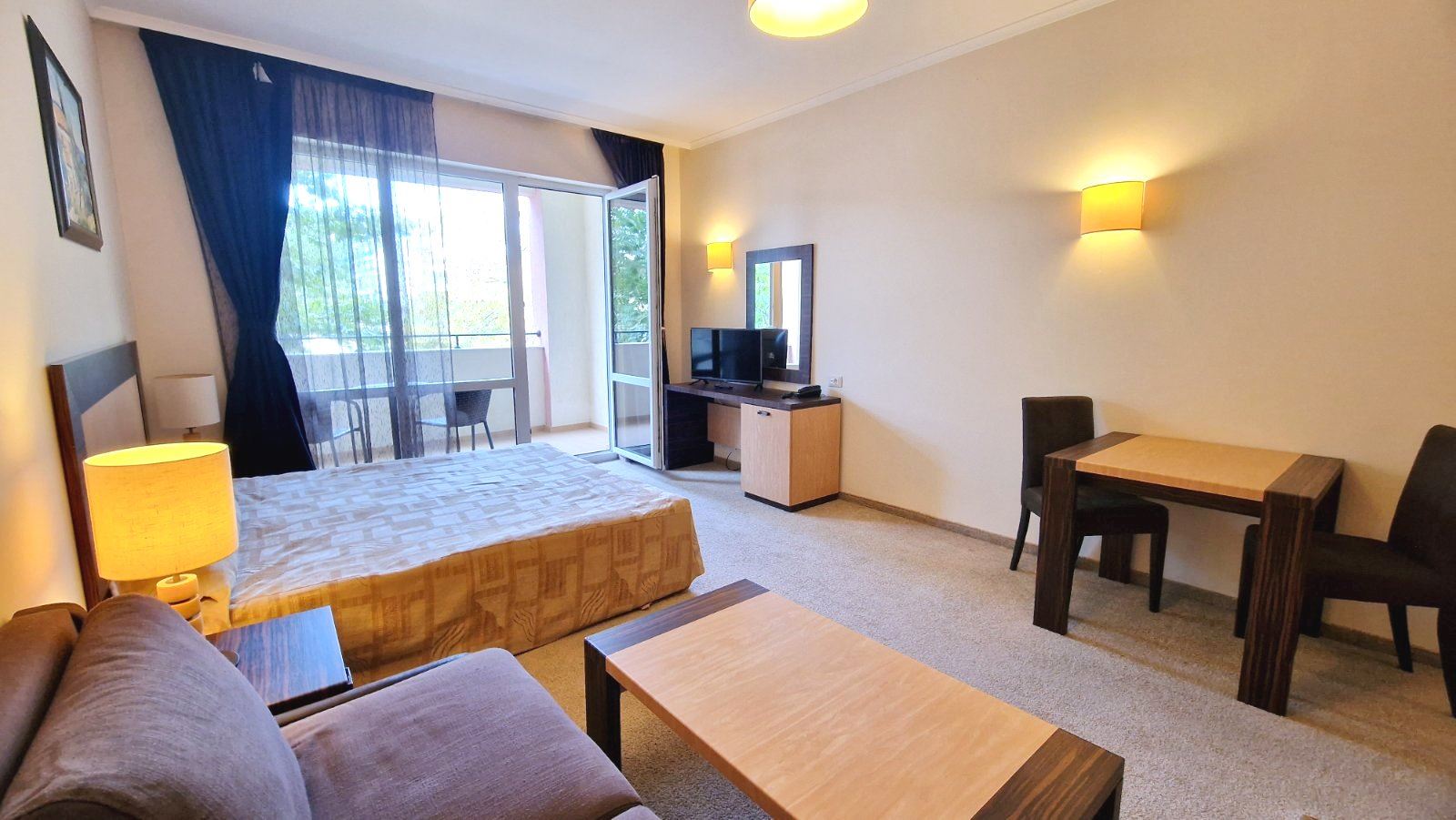 Това студио на брега на морето е отлично предложение за почивка, постоянно пребиваване или отдаване под наем. Жилището е разположено на втория етаж и предлага красива гледка към парка, планините и курорта Слънчев бряг. Разположението на първа линия до плажа прави това място идеално за любителите на морската почивка. Студиото е с площ 47 кв. м и се състои от уютна дневна с кухненски бокс, баня с вана и голям балкон. Ефективното разпределение създава уютна и функционална среда. Жилището е с модерен ремонт и е напълно обзаведено със стилни и изискани мебели. Инсталирана е и бяла техника, което го прави готов за живеене. Комплексът разполага с много удобства като ресторанти, барове, басейни за деца и възрастни, спа център, детски и спортни площадки, зони за отдих и охраняем паркинг. Целогодишната охрана гарантира безопасност и комфорт.