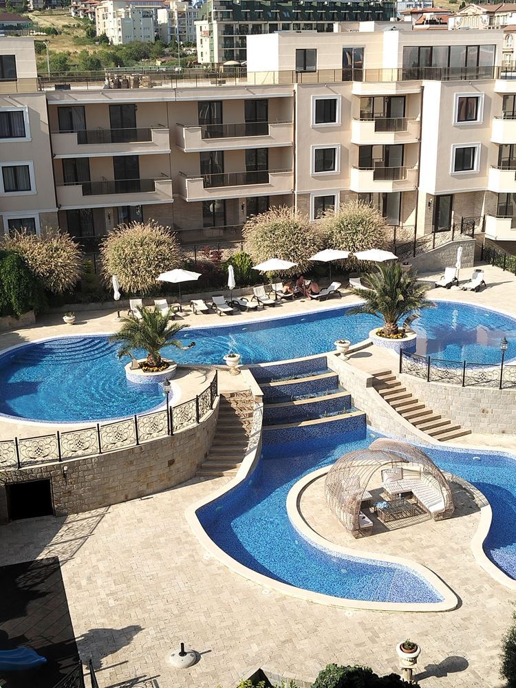 Комплексът, в който се намира апартаментът, впечатлява с висок стандарт на строителство, стилна архитектура и богато развита инфраструктура, осигуряваща максимален комфорт за своите обитатели. На територията му са разположени открити плувни басейни, включително детски, модерен СПА център и зони за релаксация, фитнес зала, както и разнообразни зони за отдих. Любителите на добрата кухня ще оценят наличието на ресторант, барове и кафенета, а лоби-рецепцията допринася за усещането за хотелски стандарт и обслужване.