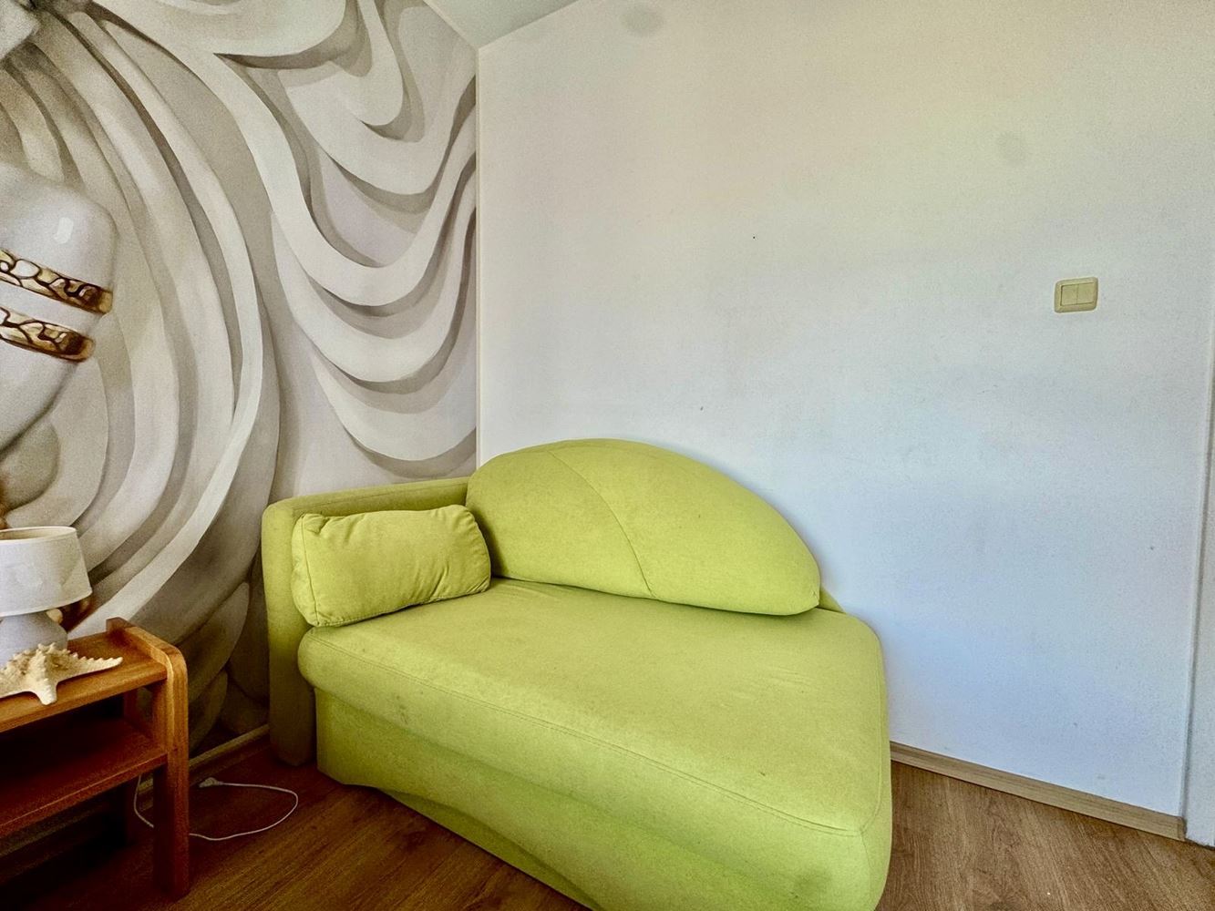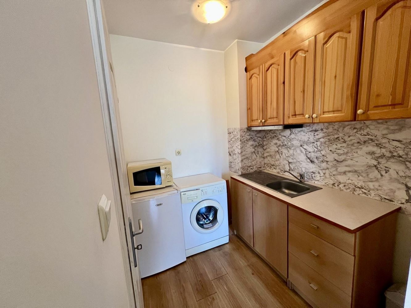 Жилището разполага с коридор, уютен кът за отдих и отделна кухня, както и функционална баня. Апартаментът е напълно обзаведен и оборудван, готов за незабавно ползване – можете просто да се нанесете и да започнете да живеете без допълнителни инвестиции.