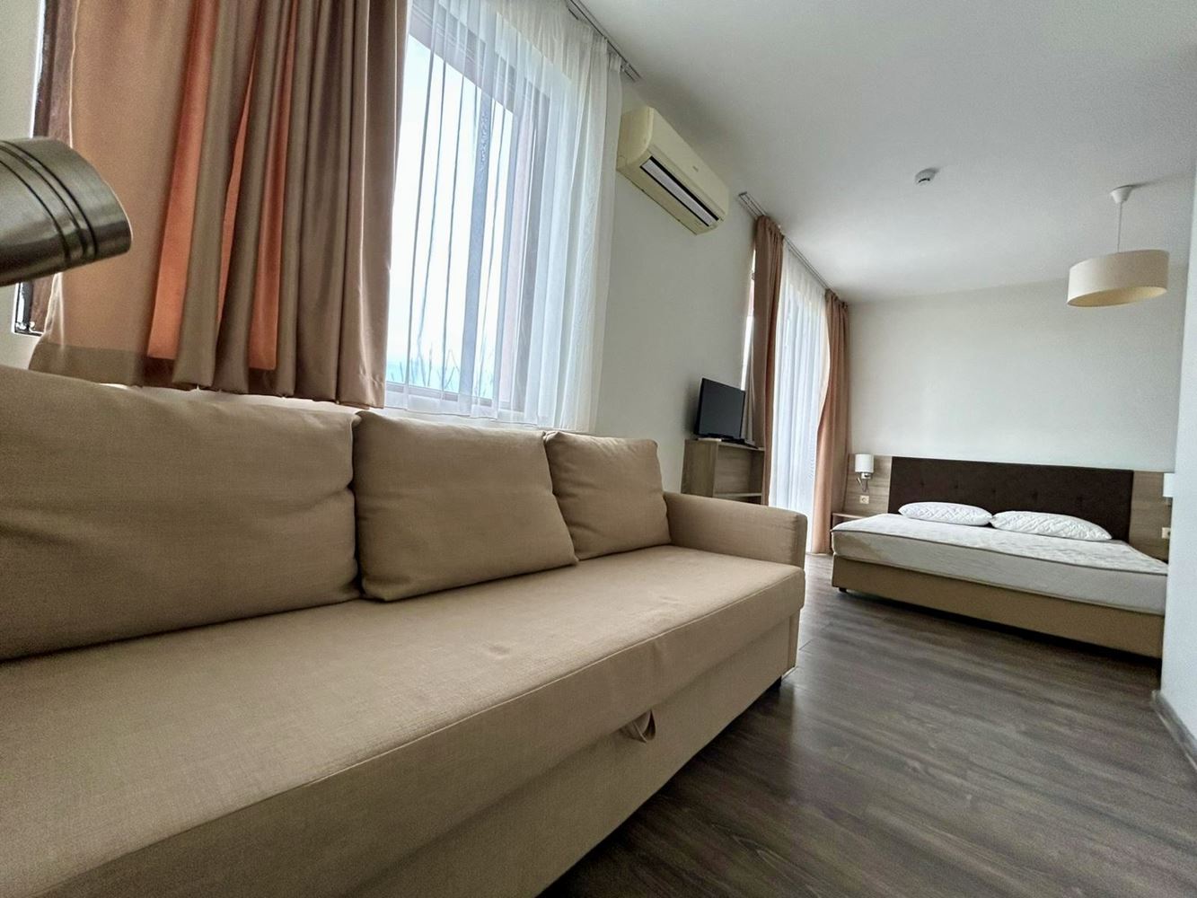 Предлагаме ви уютен студио апартамент, разположен на втори етаж в модерен и отлично поддържан комплекс в курорта Слънчев бряг. Имотът е с площ от 34,81 m² и впечатлява със своята функционалност, светлина и приятна атмосфера, подходяща както за лична почивка, така и за доходоносно отдаване под наем. Апартаментът е изключително светъл, с големи прозорци, които осигуряват изобилие от естествена светлина и разкриват красива гледка към зелените и добре поддържани площи на комплекса. Пространството е организирано практично, създавайки усещане за уют и комфорт, а спокойната обстановка го прави идеално място за отдих след дълъг ден край морето.