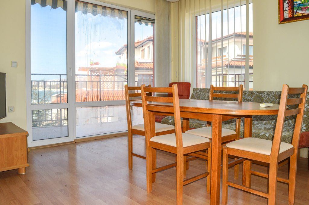 Тристаен апартамент на първа линия с директна гледка море в к.к. Елените. Апартаментът е с площ от 102 кв. м. на трети етаж. Състои се от антре, хол с кухня, две спални, две бани с WC и две тераси. Продава се напълно обзаведен. Удобства: басейни, безплатни чадъри и шезлонги, ресторант, бар, 24-часова охрана и поддръжка, зелени площи, паркинг, фитнес център, тенис корт.