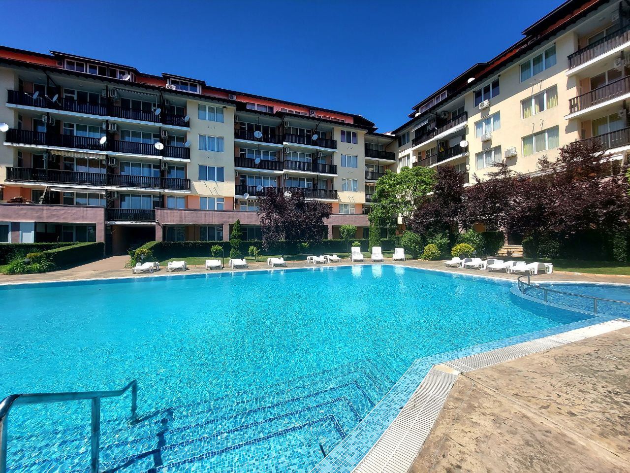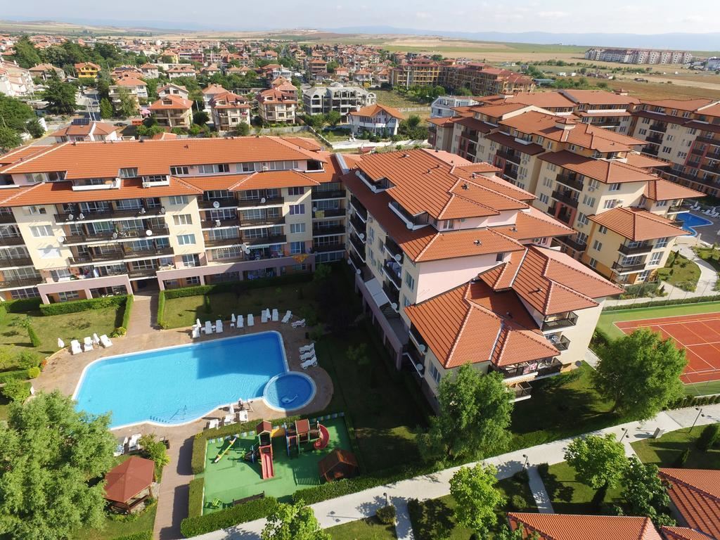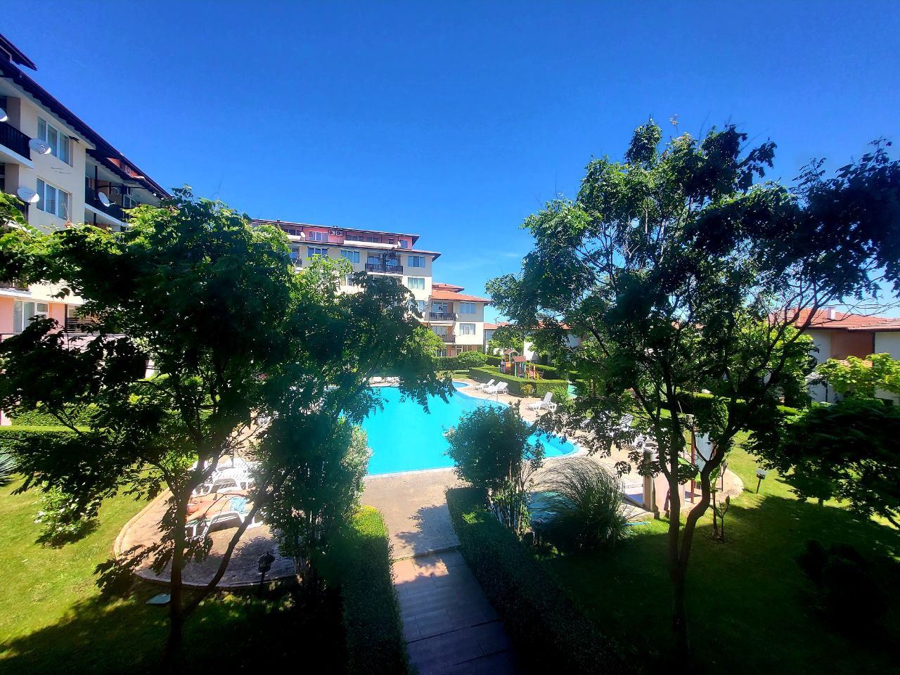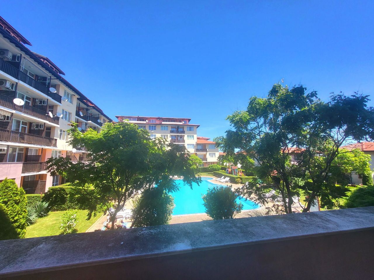 Тристаен апартамент с гледка басейн в комплекс в град Ахелой. Апартаментът е с площ 99,38 кв. м. на втори етаж и се състои от дневна с кухненски бокс, две спални, баня с тоалетна и тераса. Продава се напълно обзаведен. Удобства: басейн, бар при басейна, детски басейн, озеленени площи, детска площадка, джакузи, фитнес център, ресторант, супермаркет рецепция, охрана и други удобства.