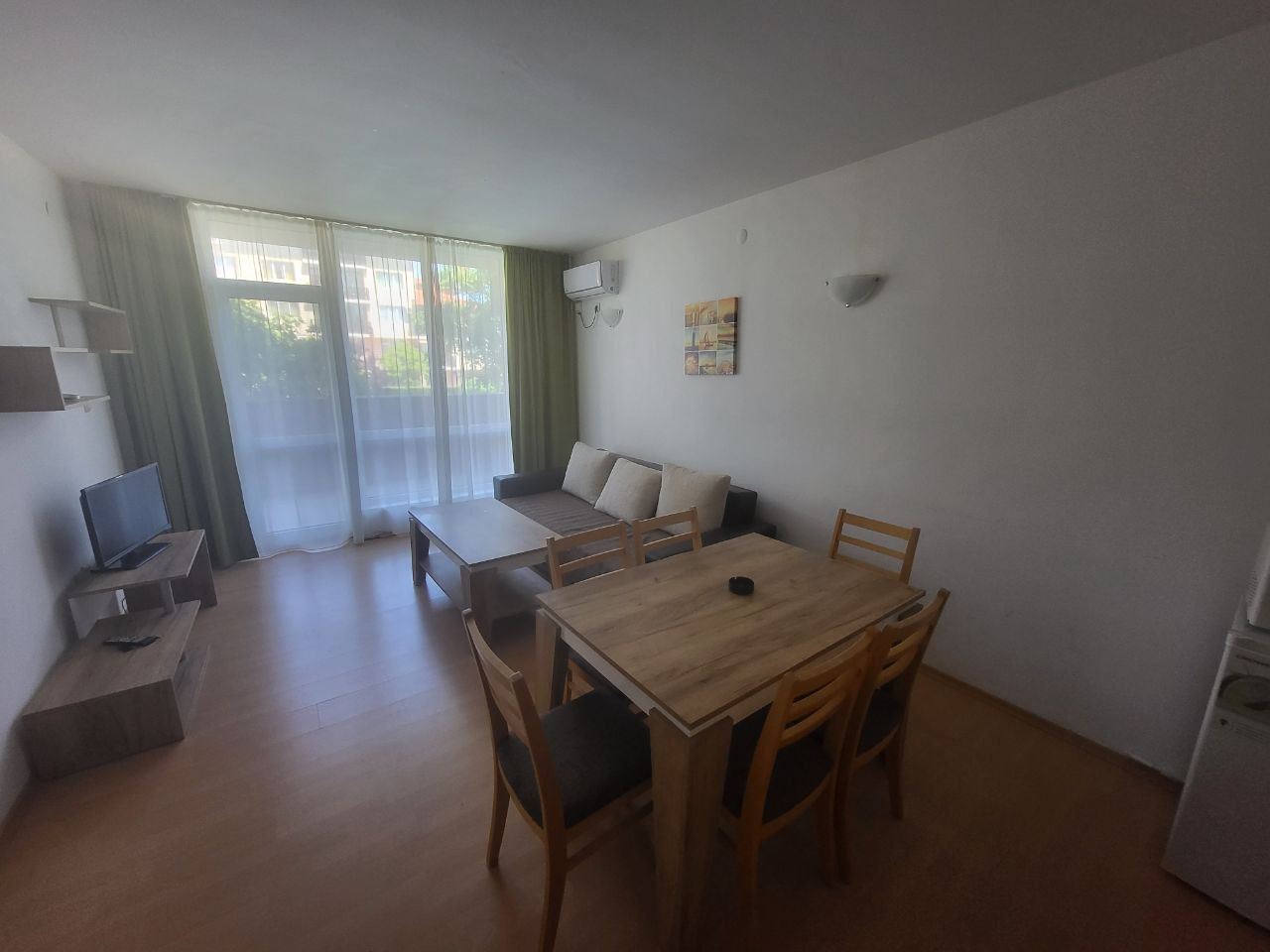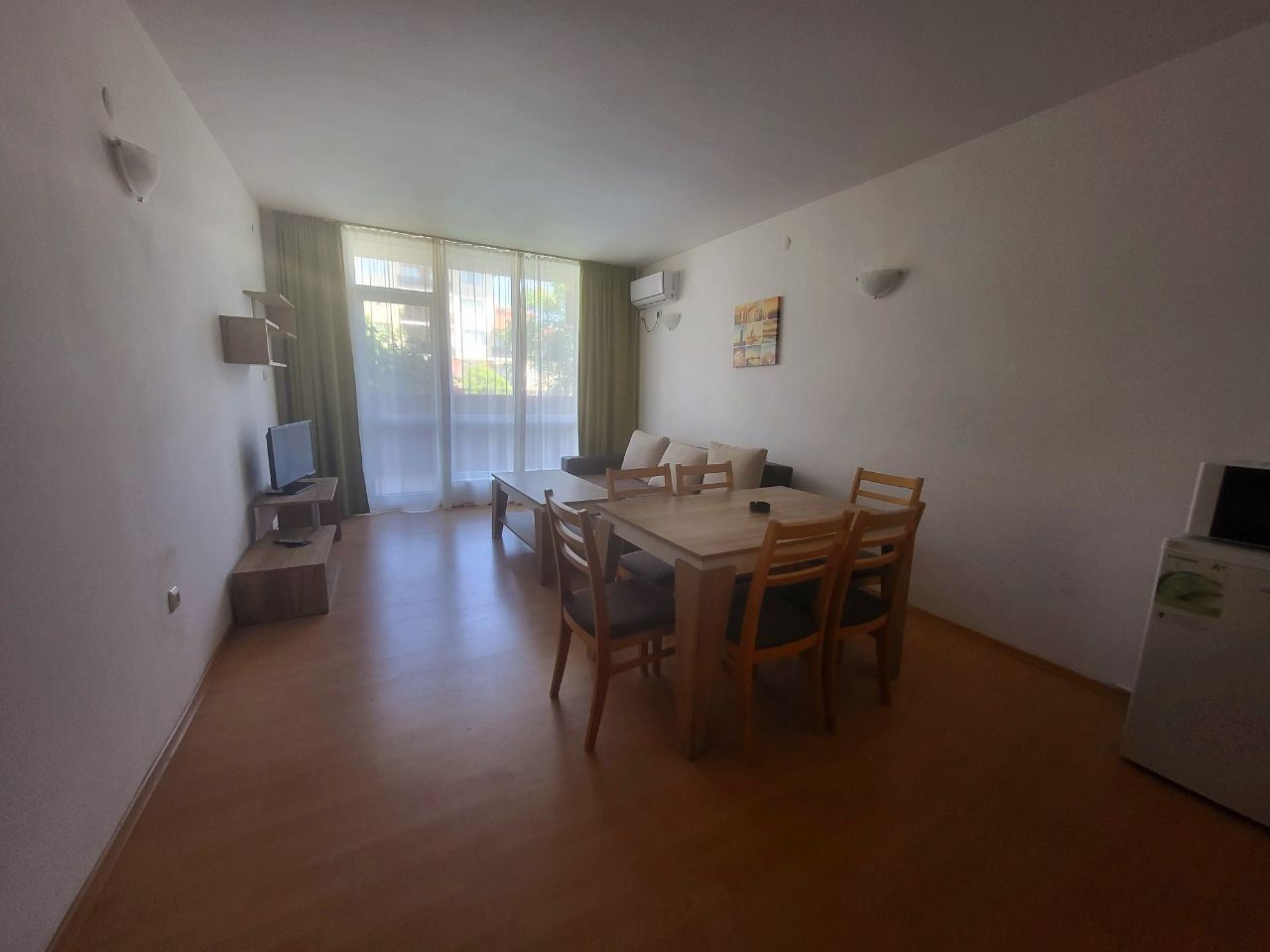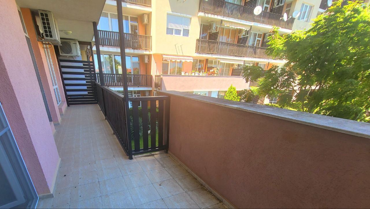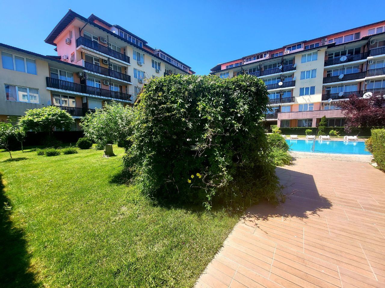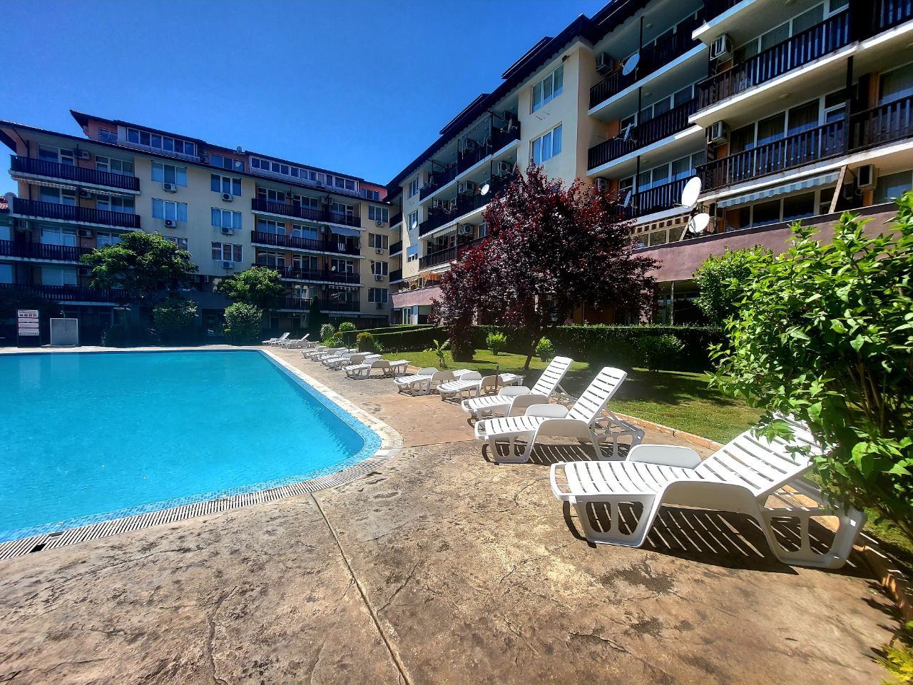 Тристаен апартамент с гледка басейн в комплекс в град Ахелой. Апартаментът е с площ 99,38 кв. м. на втори етаж и се състои от дневна с кухненски бокс, две спални, баня с тоалетна и тераса. Продава се напълно обзаведен. Удобства: басейн, бар при басейна, детски басейн, озеленени площи, детска площадка, джакузи, фитнес център, ресторант, супермаркет рецепция, охрана и други удобства.