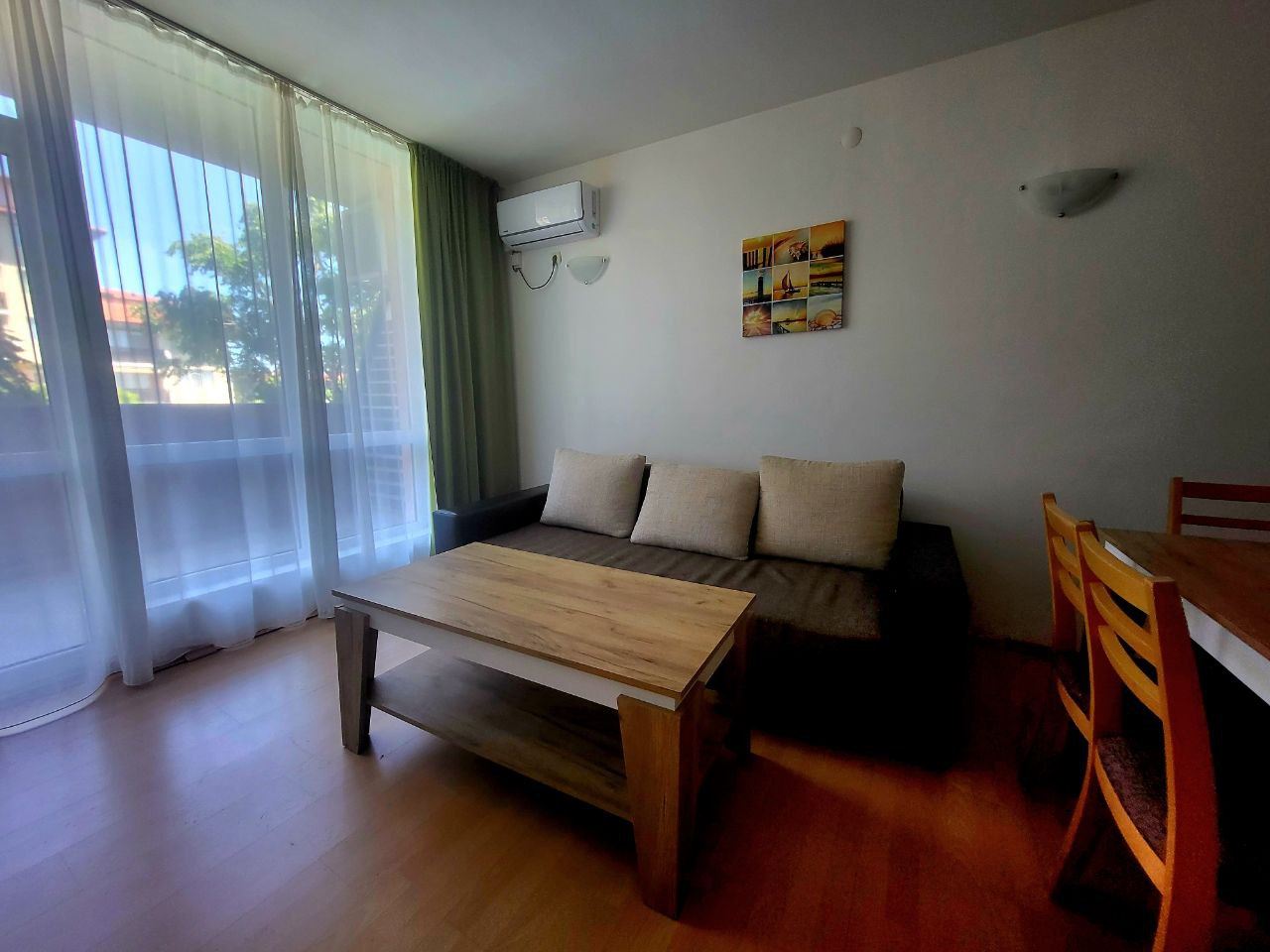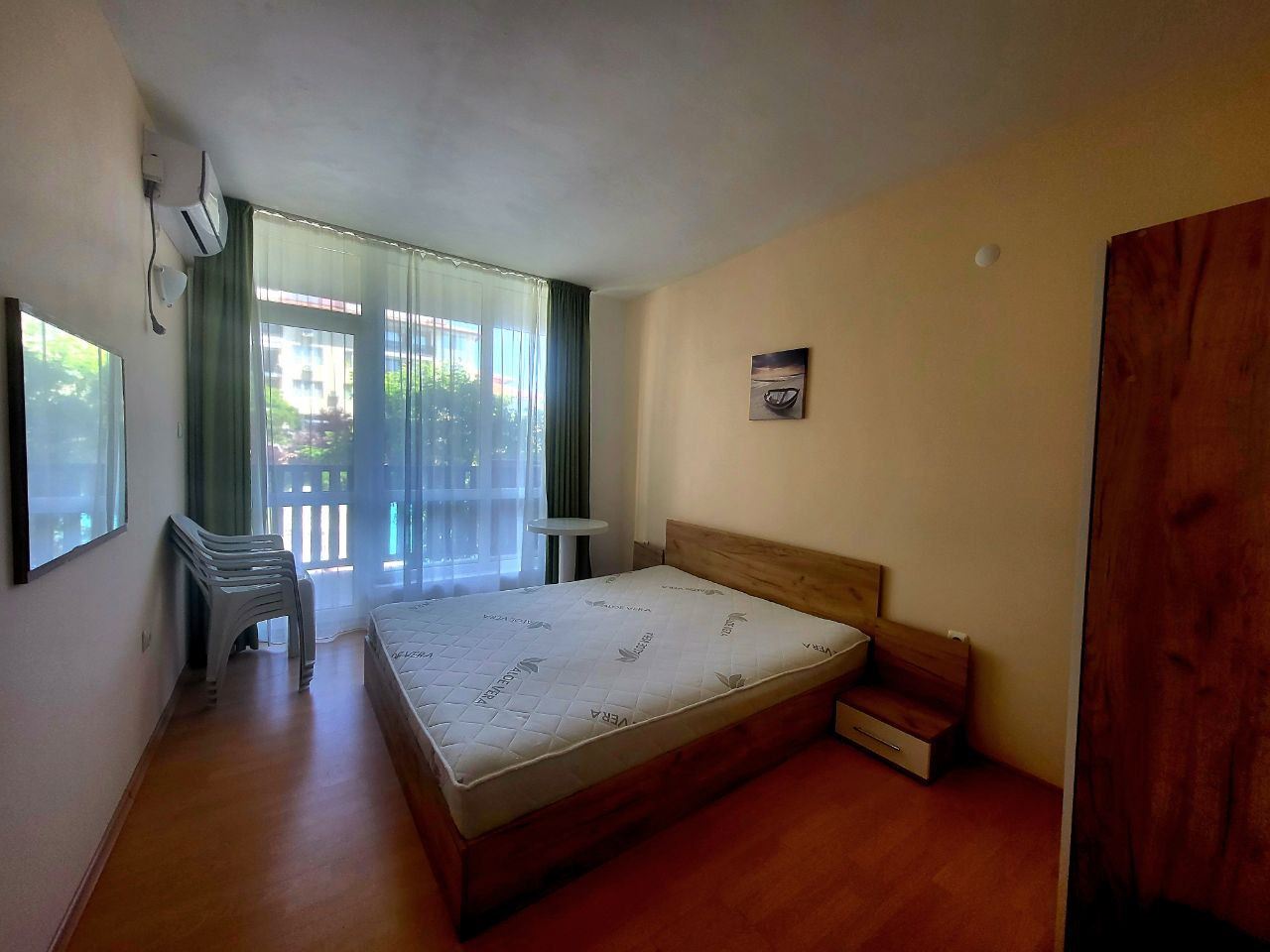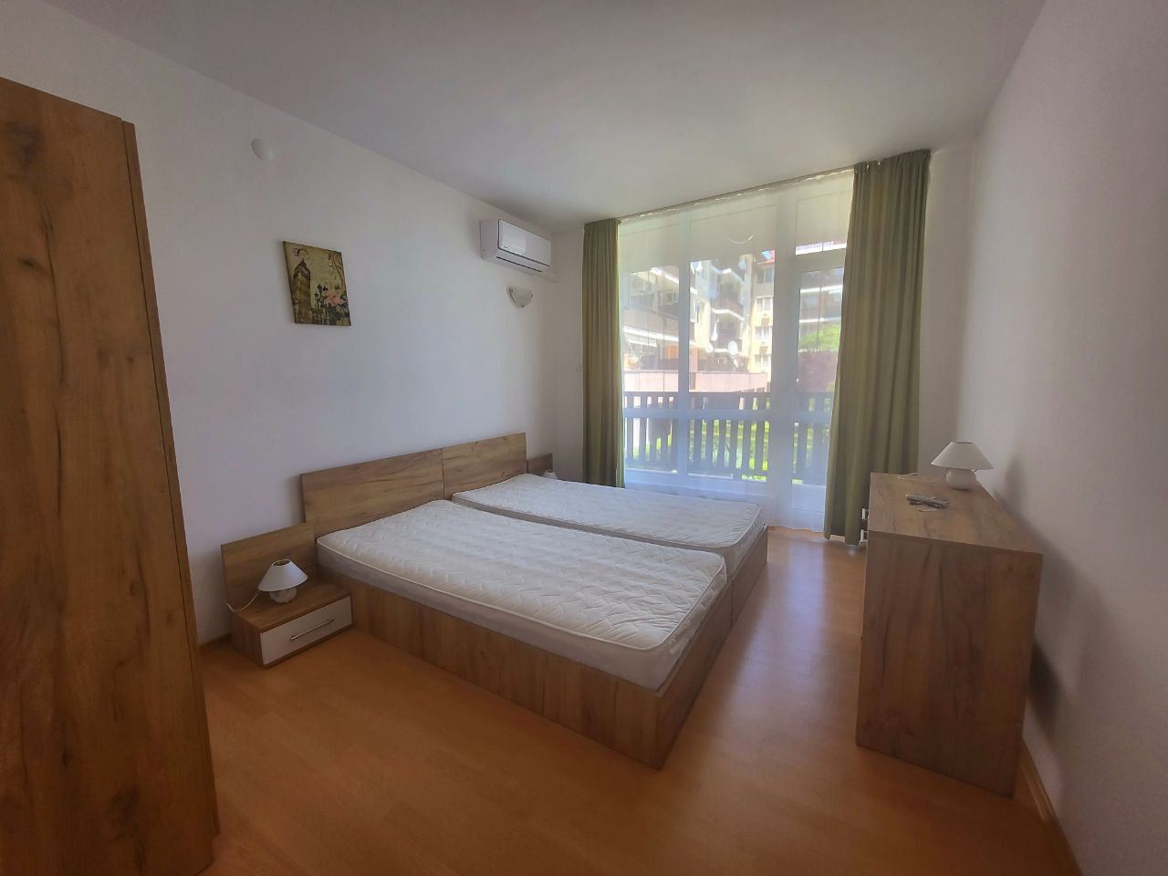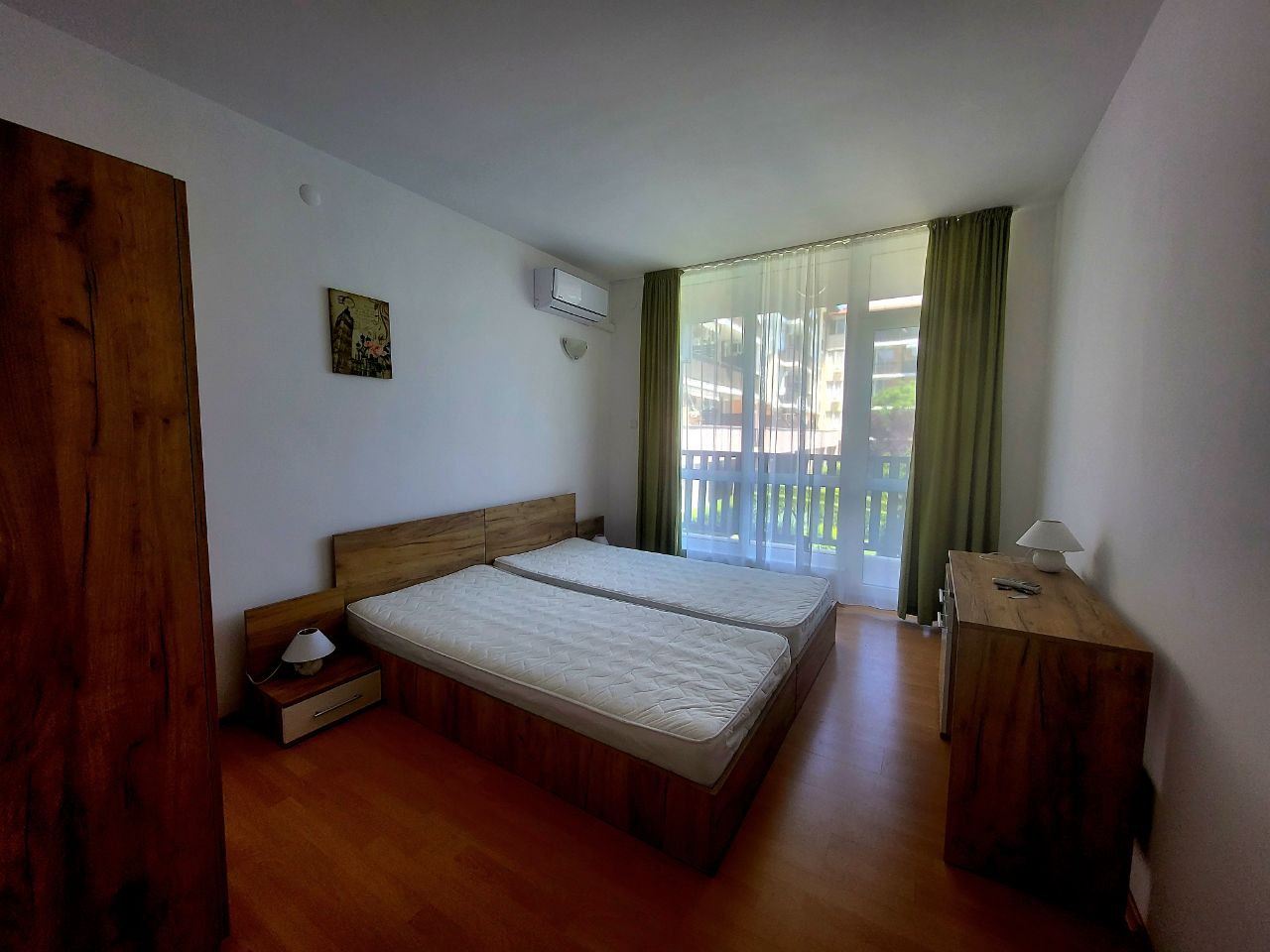 Тристаен апартамент с гледка басейн в комплекс в град Ахелой. Апартаментът е с площ 99,38 кв. м. на втори етаж и се състои от дневна с кухненски бокс, две спални, баня с тоалетна и тераса. Продава се напълно обзаведен. Удобства: басейн, бар при басейна, детски басейн, озеленени площи, детска площадка, джакузи, фитнес център, ресторант, супермаркет рецепция, охрана и други удобства.