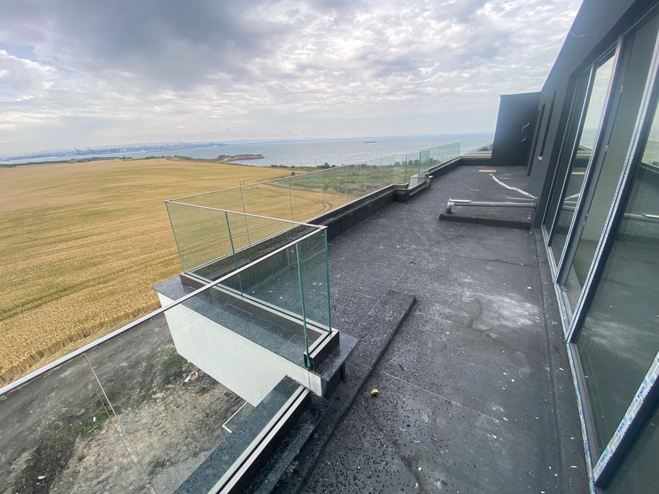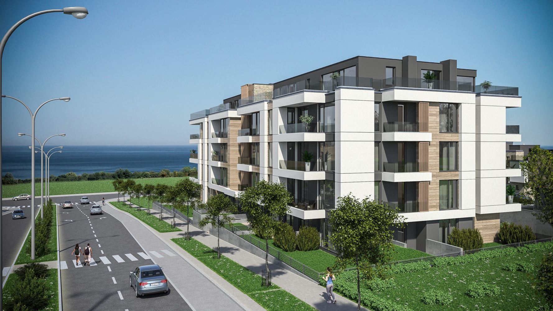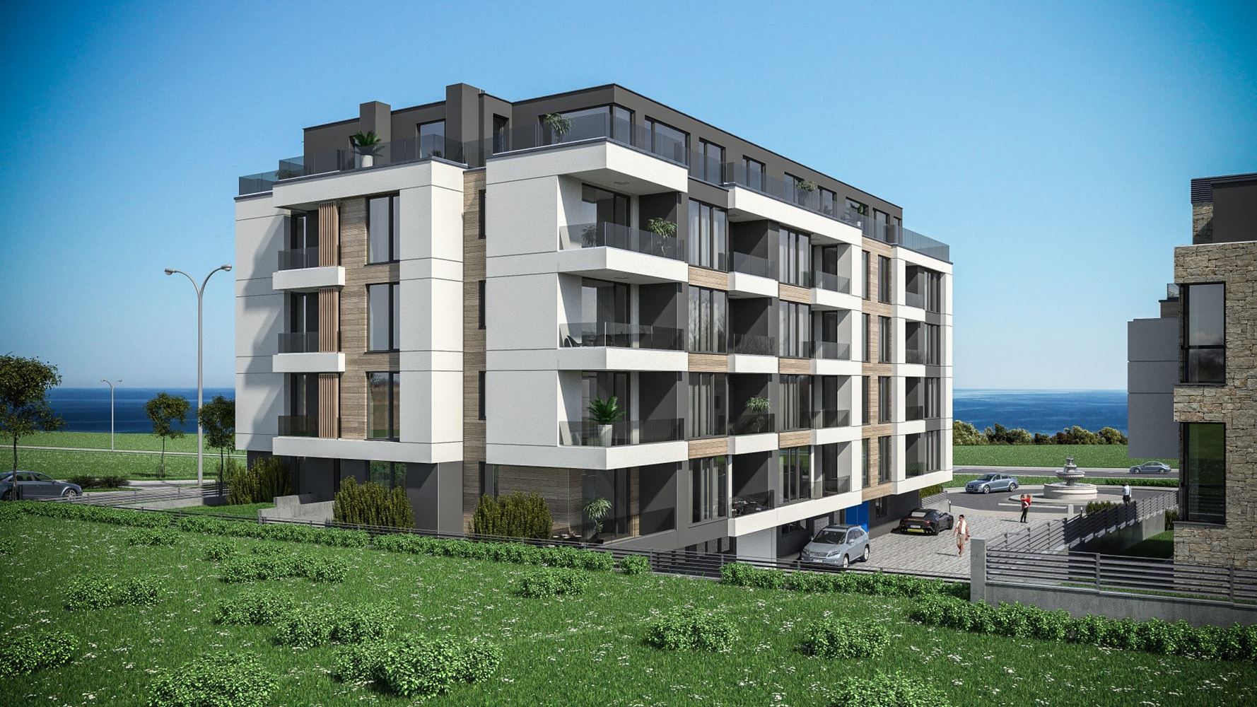 Тристаен апартамент с гледка море в нова жилищна сграда на 100 метра от морето в кв. Крайморие, гр. Бургас. Апартаментът е с площ 158,35 кв. м. на пети етаж и се състои от антре, хол с кухня, две спални, две бани с WC, килер и две тераси. Основни предимства на сградата са нейното разположение – на североизток граничи с булевард с ширина 34 метра, на югозапад с комплекс от еднофамилни къщи, отстоящи на 20 метра, на югоизток – улица с кръгово и пешеходен достъп до булеварда.
