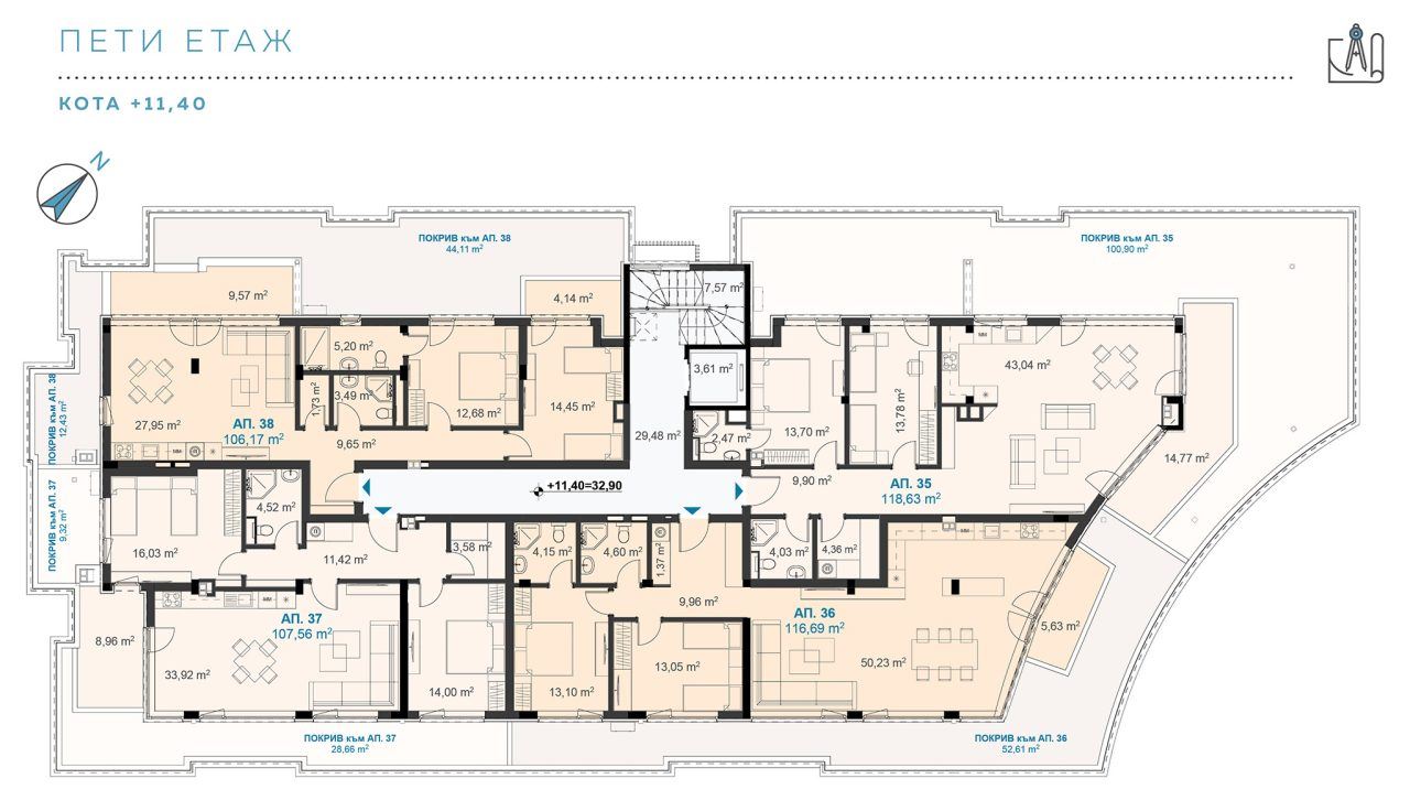 Общи части: луксозно изпълнени фоайета с настилка и стени от гранитогрес; стълбища и етажни площадки: настилка – гранитогрес; стени: гранитогрес цокъл и латекс;