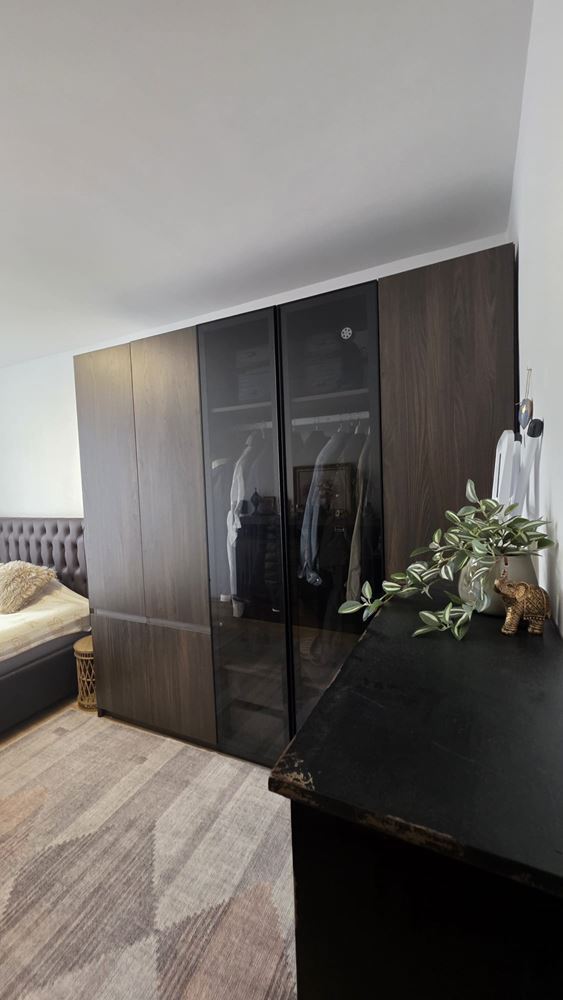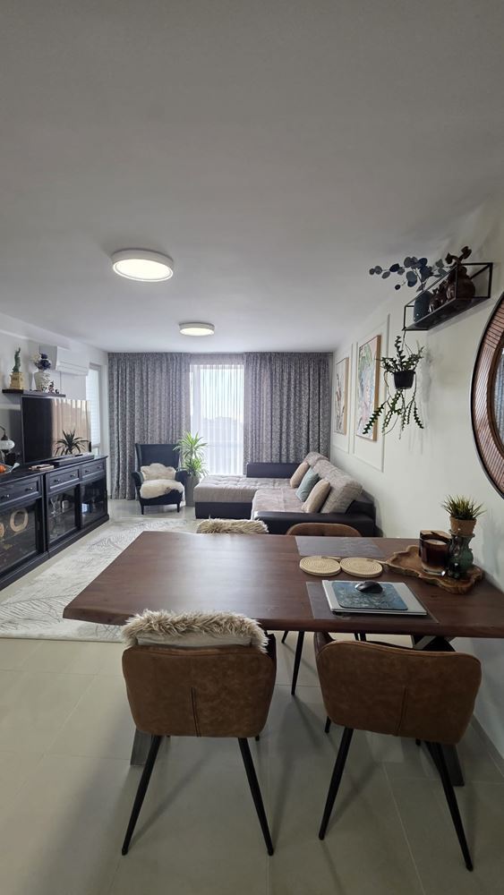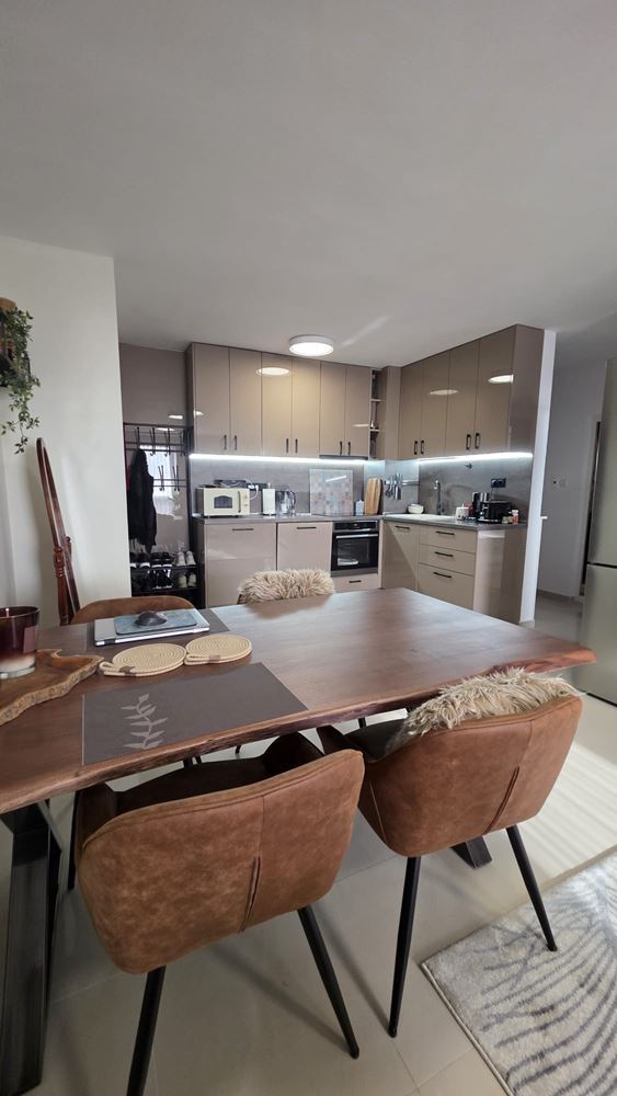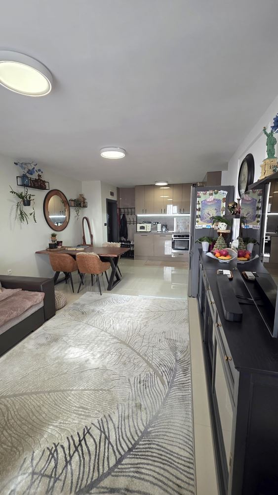 Жилището е проектирано с качествени материали – без гипсокартон, което гарантира топлина и стабилност. Пространството е рационално разпределено и включва хол с кухненска зона, две спални, две затворени тераси с директна гледка към морето и планината, както и баня с тоалетна. Светлата и просторна атмосфера, съчетана с удобното разпределение, създава усещане за уют и комфорт.