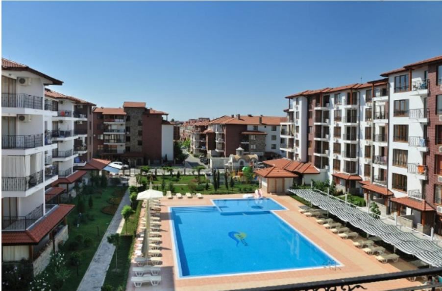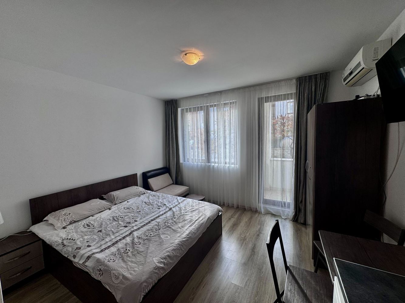 Студиото е напълно обзаведено и оборудвано, включвайки кухненски кът, просторен кът за спане и уютна тераса, откъдето можете да се наслаждавате на красивите зелени градини на комплекса. Всяко пространство е обмислено така, че да предлага максимален комфорт и функционалност, а терасата предоставя чудесно място за сутрешно кафе или вечерна релаксация сред природата.